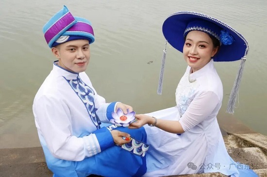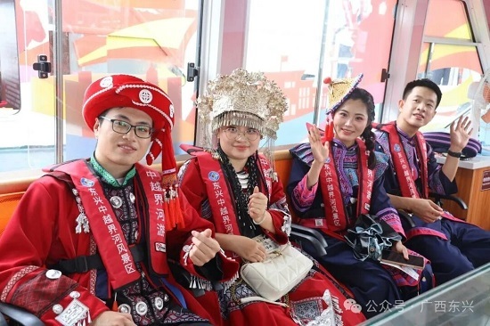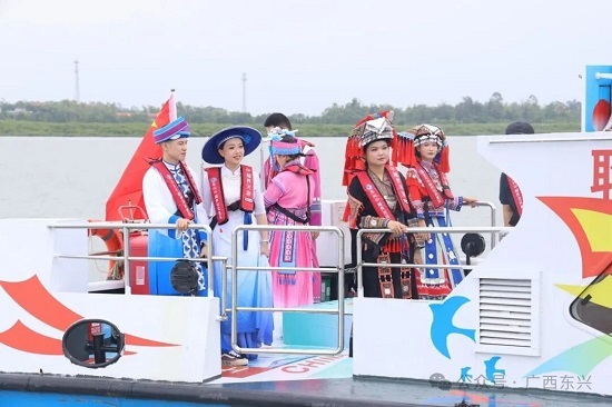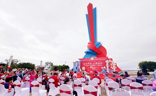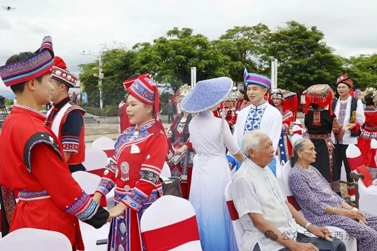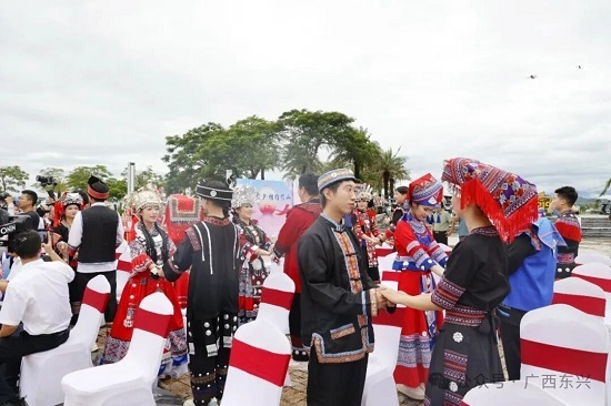 8月29日,“边关情牵·山海为证”——东兴中越界河景区户外颁证点启用仪式暨七夕多民族集体婚礼在竹山山海相连地标广场举行,来自壮族、侗族、仡佬族、毛南族、彝族、瑶族、京族等少数民族的16对新人,身着各自民族服饰,在祖国壮丽的海疆边境许下爱情誓言,这场传统与现代交融的婚俗仪式,为传统婚俗注入时代新意。